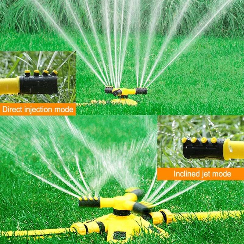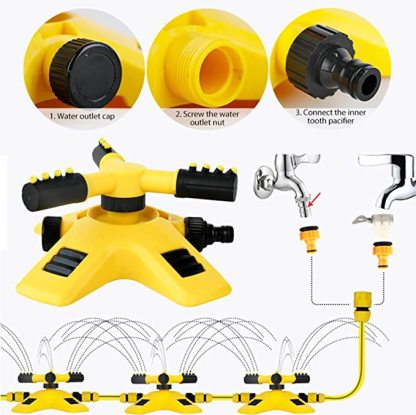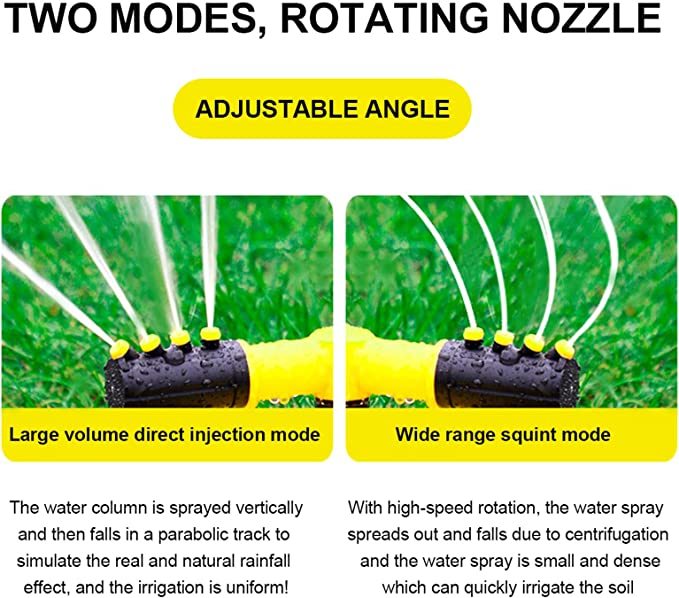 Easy to use -The garden sprinklers is easy to use, combine the rotary triple arm nozzle and the connector with the base. Link faucet, turn on water switch, Start watering your garden and lawn.