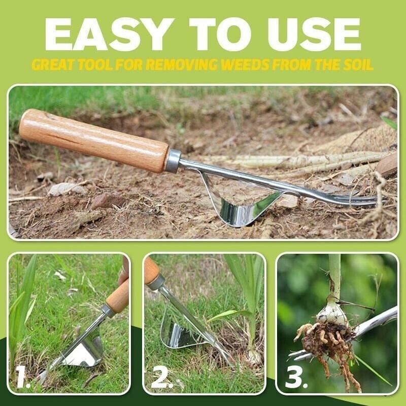 ① Y-SHAPED SHOVEL:Simply rest the curved metal base on the ground and dig arounthe roots to pull and remove weeds.