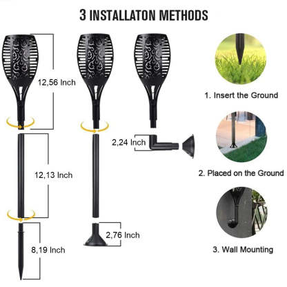 - EASY TO INSTALL & PROMISE: Simply connect the ground stake & connector to tighten it. No screws or any other tools required. The torch lights enjoy free replacement or refund during 12 months promise period.